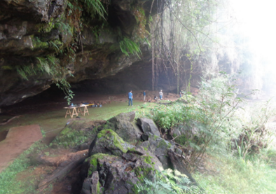 Las arqueólogas, Dras. Romina Silvestre, Maricel Pérez y Amanda Ocampo, planificaron la prospección e implementaron las tareas en el Parque Natural Municipal Gruta India (en adelante PNMGI) con parte del equipo de investigación y estudiantes de la carrera de Historia. Siguiendo las referencias de las autoridades del pueblo, de los guardaparques del PNMGI, de los ingenieros de la Empresa Forestal Arauco Argentina S.A. y con la cartografía existente, fuimos pergeñando una acción conjunta en la prospección arqueológica a unos 500 m al noroeste de la Gruta India (ver Figura 7), así nos encontramos con un nuevo sitio: la Cueva del Puma (ver Figura 8).