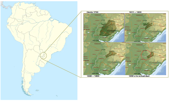 Fuente: Elaboración propia (2026). Referencia: En el primer mapa se ubica al territorio de la Provincia de Misiones en la Argentina y Sudamérica; y en el segundo se muestra al territorio en diversas configuraciones según distintas etapas históricas desde el S. XVIII a la actualidad; en este último periodo se marca en un círculo la denominada Región de Frontera.