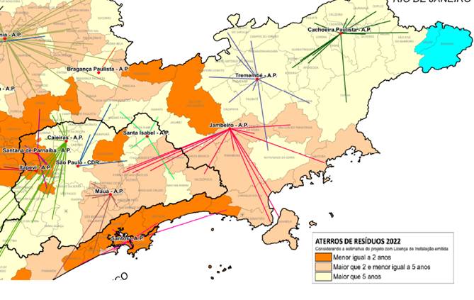 Os resíduos sólidos urbanos gerados em Caraguatatuba também são destinados para o aterro da região, na cidade de Jambeiro-SP, o qual atingirá sua capacidade máxima em até 5 anos, veja Figura 5 (CETESB, 2024). Entretanto, não há informações sobre URCD’s encontradas na região, levando a crer que o RCD’s se destina apenas ao aterro de Jambeiro.