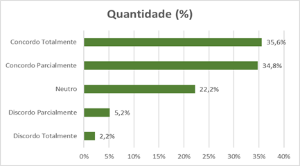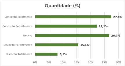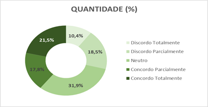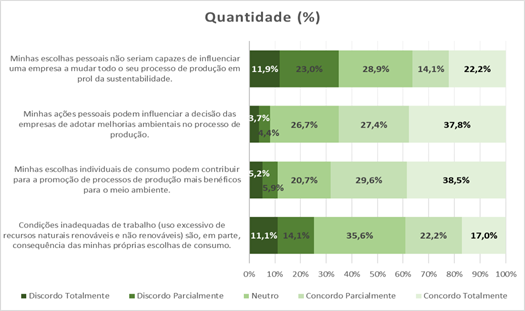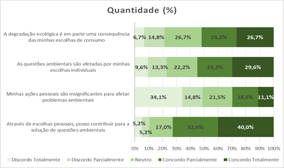 Em relação às questões ambientais serem afetadas pelas escolhas individuais dos respondentes, a maioria (29,6%) concordou totalmente, 25,2% concordaram parcialmente e 22,2% afirmaram neutralidade.