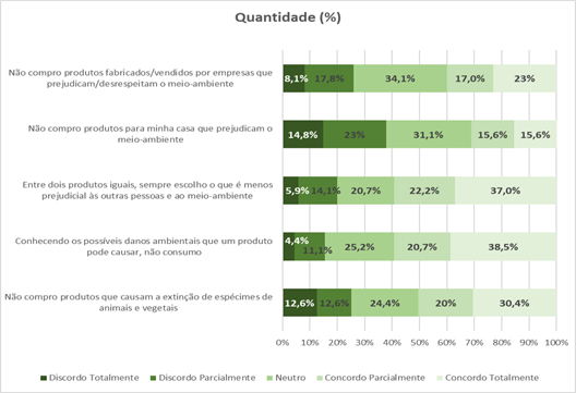 Acerca das ações pessoais serem insignificantes para afetar problemas ambientais, 34,1% afirmaram discordar totalmente, seguido dos 21,5% que responderam neutralidade e 18,5% que afirmaram concordar parcialmente. Por fim, a afirmativa que discorre sobre as escolhas pessoais serem importantes para a contribuição da solução dos problemas ambientais, a maioria (40%) afirmou concordar totalmente e 32,6% afirmaram concordar parcialmente.