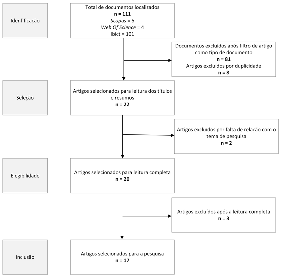 Após a leitura completa e aplicação dos critérios de avaliação estabelecidos no protocolo de revisão sistemática, restaram 17 artigos aceitos para a coleta de dados. O fluxograma do processo de seleção dos estudos está demonstrado na Figura 1.