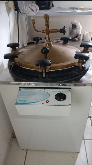 No tocante à autoclave, que pode ser observada na Figura 3, trata-se de um equipamento utilizado para a esterilização do meio de cultura, vidrarias e outros materiais utilizados no ambiente asséptico da câmera de fluxo laminar.