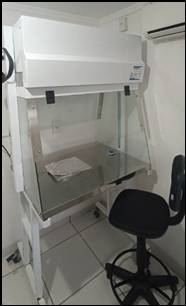 A câmara de fluxo laminar, que pode ser observada na Figura 5, é um equipamento utilizado para a manipulação estéril das culturas in vitro, onde o ar é forçado a passar por meio do filtro bacteriológico, criando um ambiente asséptico e evitando a entrada do ar externo contaminado.