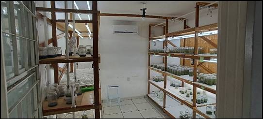 Ambiente externo do laboratório para aclimatização das plantas após serem retiradas dos frascos, proporcionando condições controladas para a adaptação ao ambiente natural.
