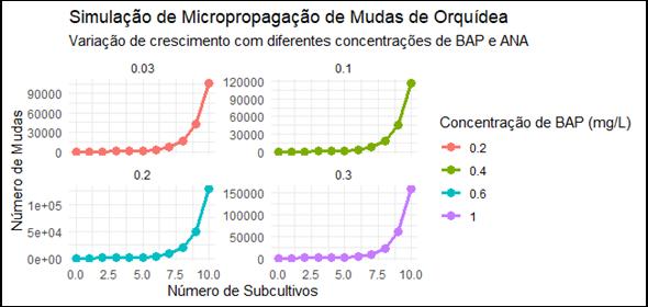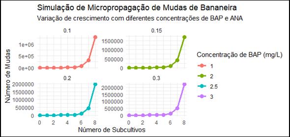 The expected results were obtained through a computer simulation of in vitro seedling growth. The simulation was carried out using the R programming language, with seedlings of orchids, bananas, and blackberries, based on a model incorporating biological parameters and growth regulators. Variables such as the concentration of the growth regulators 6-Benzylaminopurine (BAP) and Naphthaleneacetic Acid (NAA), the number of subcultures, and the multiplication rate of the seedlings were included.