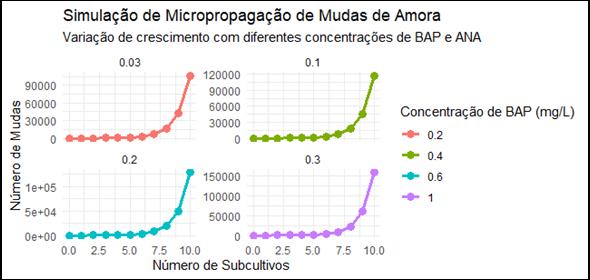 O uso do programa RStudio (2025) possibilitou emular diversos cenários, poupando tempo e recursos. Os resultados obtidos neste estudo demonstram que a micropropagação de mudas in vitro é uma técnica eficiente e viável para a produção em larga escala de plantas de alta qualidade. A utilização de reguladores de crescimento vegetal mostrou-se fundamental para a obtenção de plântulas vigorosas, com alta taxa de sobrevivência e bom desempenho no processo de aclimatação.