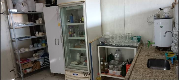 Estão contidos nessa sala: pias, autoclave, deionizador, geladeira, prateleiras e armários, conforme pode-se observar, de forma panorâmica, na Figura 1.