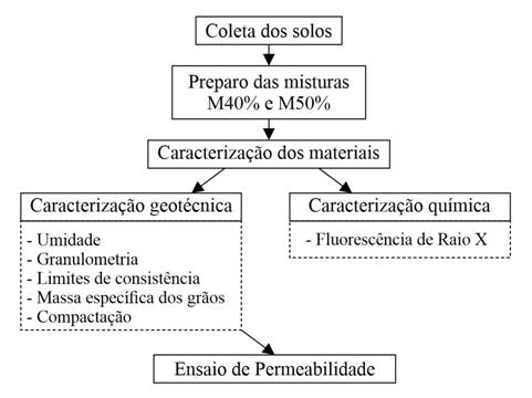 Os ensaios para determinar o desempenho dos solos como material impermeabilizante em aterros sanitários consistiram na caracterização química, geotécnica e determinação da condutividade hidráulica do solo. Na Figura 2 estão sintetizados os procedimentos experimentais realizados nesta pesquisa.