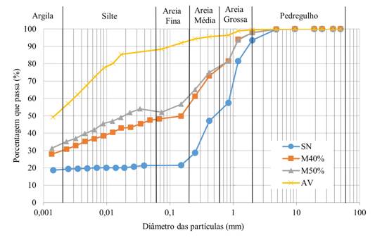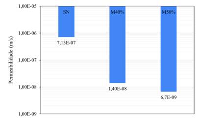 Baseado na Tabela 6, nota-se que o solo natural é ineficaz para a aplicação na camada de base de aterros sanitários, pois não atende os valores estabelecidos por nenhuma das referências. As misturas M40% e M50% atendem o valor de referência da NBR 13896 (ABNT, 1997), mas não são suficientes para as demais normativas, sendo acima do estabelecido pela CETESB (1993) e USEPA (1991). Desse modo, a utilização das misturas para camadas impermeabilizantes em aterro sanitário demanda mais cautela, visto que elas não atendem às demais referências.