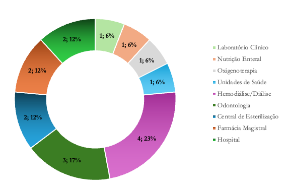Esses resultados apontam para uma ampliação do envolvimento da comunidade científica na pesquisa e na procura por soluções inovadoras para o monitoramento do consumo de água. Em relação aos tipos de PSS estudados, pode-se indicar 9 tipos de atividades de saúde distintas, com destaque para publicações em Centros de Hemodiálise/Diálise, Hospitais, Centrais de Material Esterilizado e Clínicas Odontológicas (Figura 2). Essa diversidade de PSS sugere haver uma vasta gama de atividades a serem monitoradas em relação ao controle da potabilidade, prevenção de doenças e/ou garantia da qualidade de processos relacionados com uso de água.