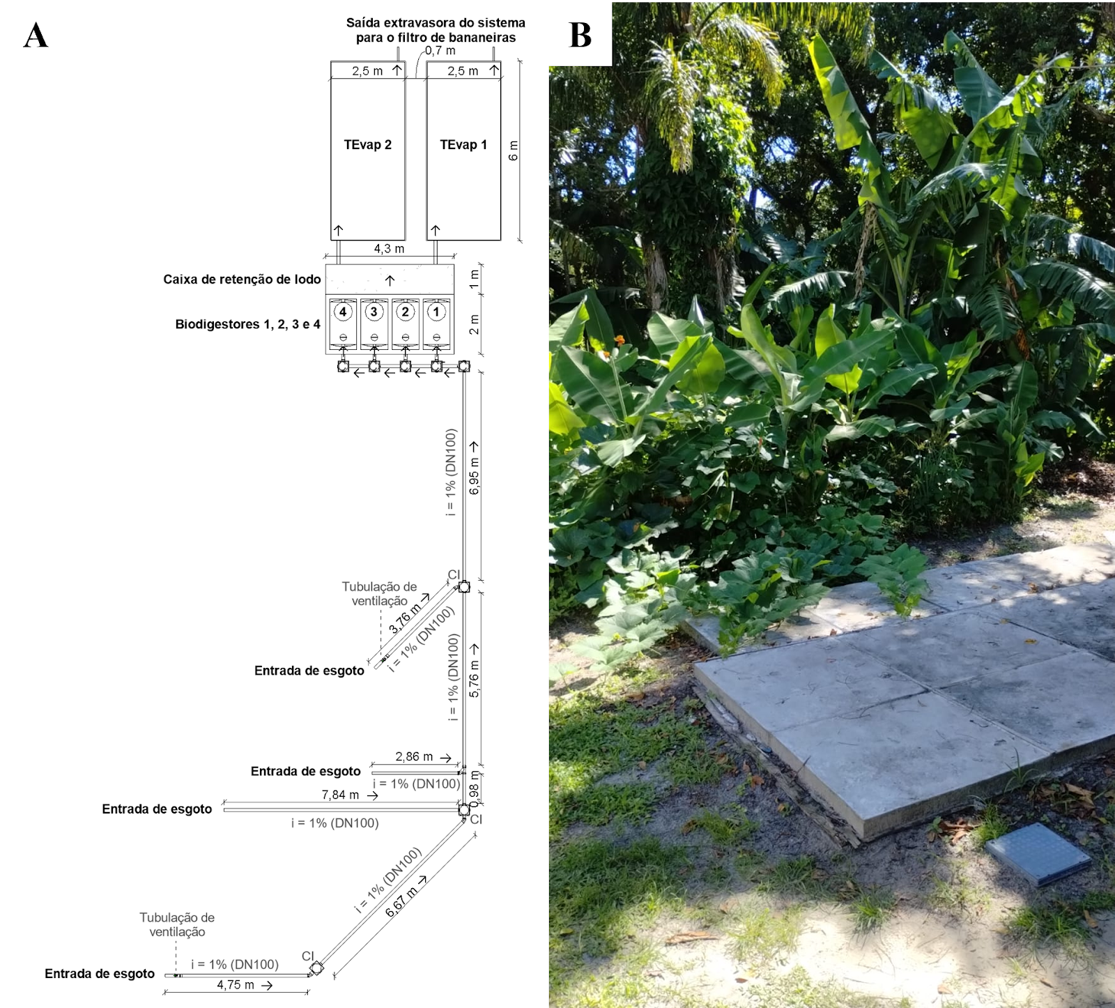 O TEvap implantado nesta unidade possui 9 m² de área, com dimensões de 6 m de comprimento, 1,50 m de largura e 1,7 m de profundidade. O sistema inclui também uma caixa de retenção de lodo para os dois biodigestores e um tanque séptico seguido, que atua como extravasor do TEvap. A Figura 5 apresenta a planta baixa e uma fotografia do sistema em operação. O custo total com materiais foi de R$ 11.036,65, também desconsiderando os custos com mão de obra.