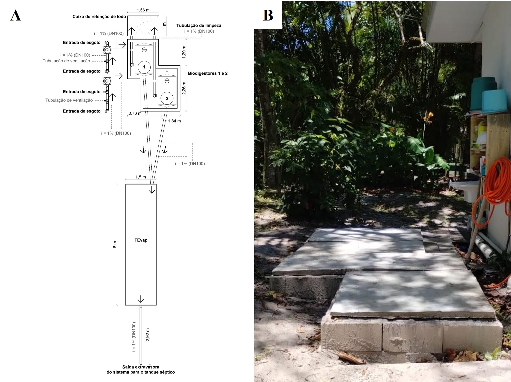Com base no diagnóstico realizado, foi planejado o dimensionamento dos sistemas de tratamento descentralizados, integrando biodigestores e TEvap. Embora o projeto e a instalação desses sistemas tenham ocorrido em 2022, seguindo normas anteriores, NBR 7.229:1993 (ASSOCIAÇÃO BRASILEIRA DE NORMAS TÉCNICAS,1993) NBR 13.969:1997 (ABNT,1997), que foram canceladas e substituídas pela NBR 17.076:2024 (ABNT, 2024), e orientações encontradas em uma cartilha sobre saneamento ecológico da Fundação Oswaldo Cruz (FIOCRUZ) em parceria com a Fundação Nacional de Saúde (FUNASA) (FIOCRUZ, 2019). Os parâmetros adotados permaneceram compatíveis com a NBR 17.076:2024.