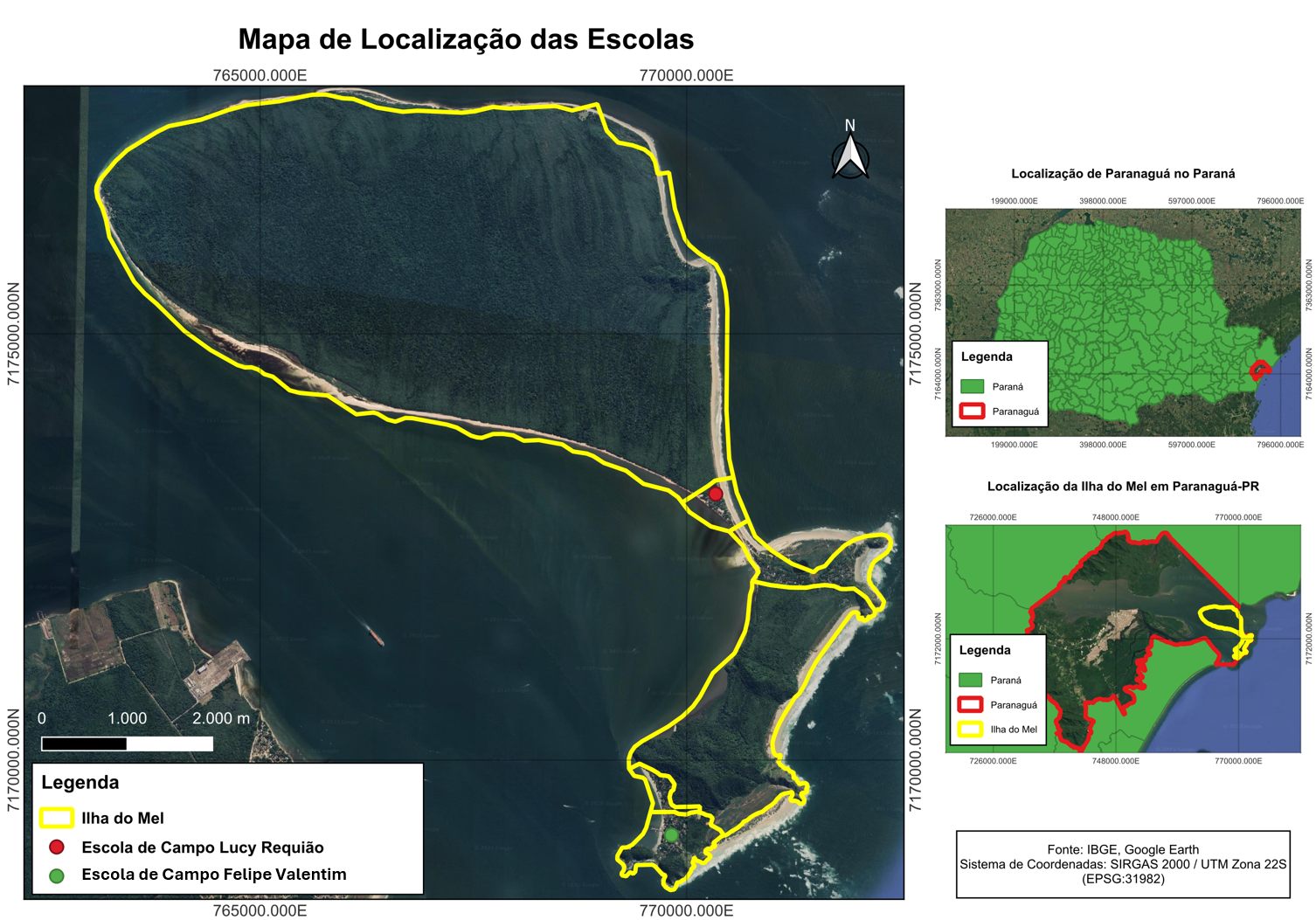 Inicialmente, foi realizado levantamento em campo para reconhecimento das condições físicas, ambientais e infraestruturais das unidades escolares. A distribuição espacial da Ilha do Mel e a localização das escolas estão apresentadas na Figura 1.