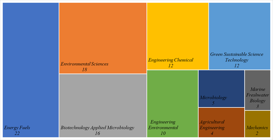 Na análise de áreas abrangidas pelos artigos, a plataforma WoS identificou 23 entradas no total e, destacou-se as 10 áreas mais relevantes (Figura 3). Em que “Energy Fuels” obteve 22 artigos, essa área apresenta avanços significativos nos últimos 50 anos. Deve-se ao fato que, algumas microalgas podem produzir 70% da sua biomassa em lipídios, tornando-as mais promissoras que outros grupos investigados para biocombustíveis ( Katiyar et al., 2017). Além desta área, observa-se a multidisciplinaridade delas, consequentemente a importância dos diferentes campos do conhecimento.