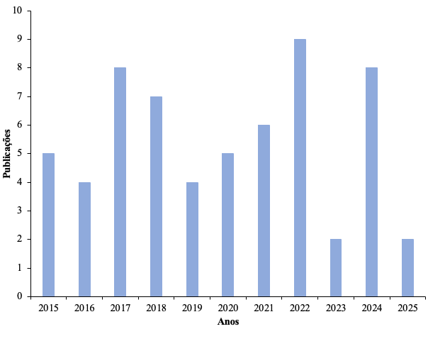 A Figura 4, apresenta-se a tendência das publicações ao longo dos últimos 10 anos, observando uma oscilação ao longo dos anos. e em 2022 foi o ano que apresentou o maior número de artigos publicados, nove. Ressalta-se que em 2025, os dados correspondem apenas às publicações realizadas até junho.