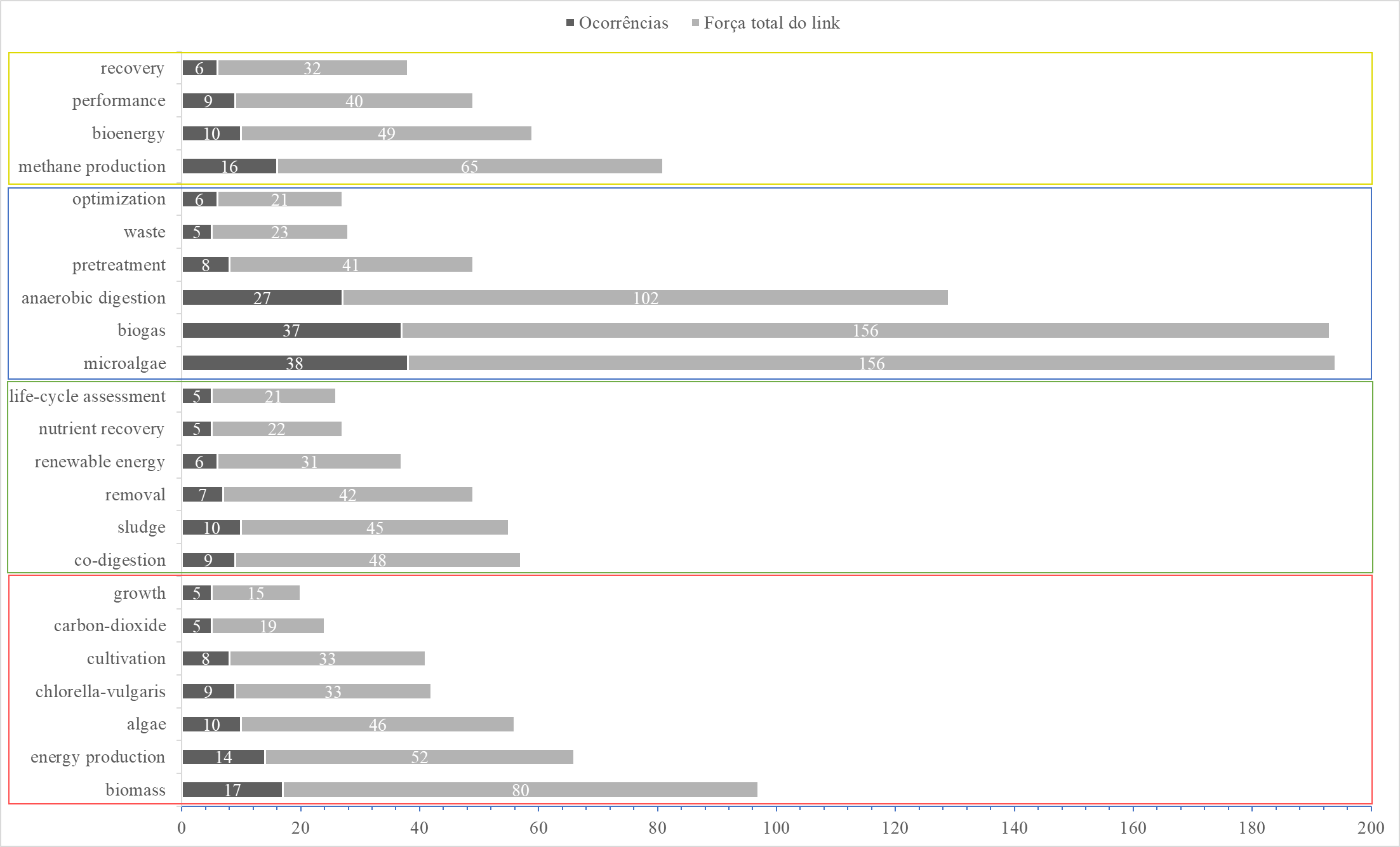 Na Etapa II do estudo, identificaram-se 447 palavras-chave, em que 29 foram selecionadas, por ocorrerem ao menos cinco vezes. A análise destaca-se os termos “biogás” e “microalgas”, ambos com força total de link de 13,3% (Figura 5). A presença de termos como “dióxido de carbono”, “análise de ciclo de vida”, “resíduos” e “bioenergia”, reforça o caráter multidisciplinar e circular da abordagem. Indicando que, a produção de energia não ocorre de forma isolada, mas integrada ao reaproveitamento de resíduos (Kumari et al., 2021) e sequestro de carbono. Por sua vez, a frequência elevada da “Chlorella vulgaris”, confirma o predomínio dessa espécie como espécie modelo , evidenciado pelo alto teor lipídico, facilidade de cultivo e elevada produtividade de biomassa.