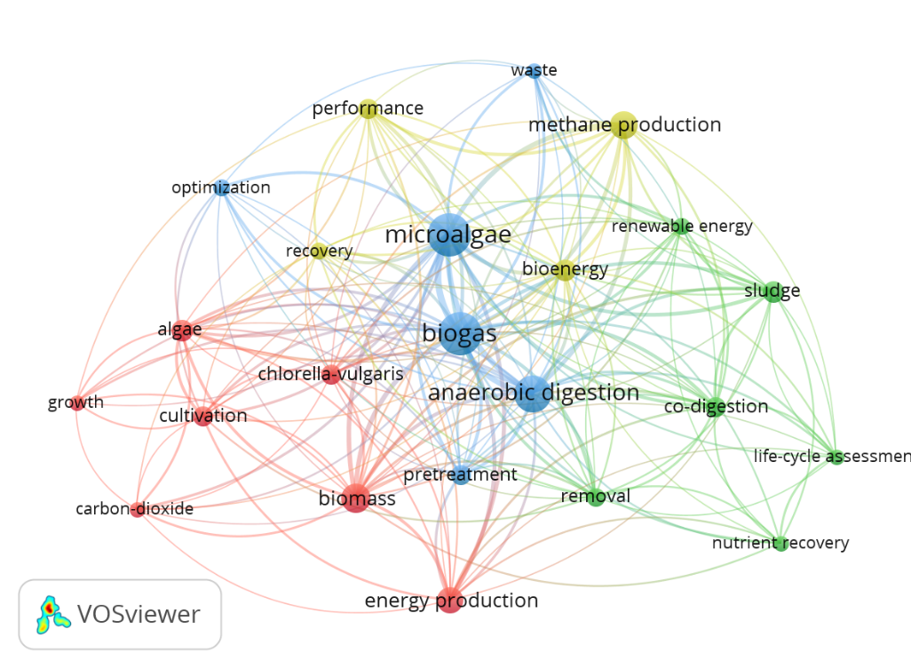 Diante desse contexto, este estudo teve como objetivo realizar uma análise bibliométrica da produção de biogás a partir de microalgas, identificando autores, países, áreas e tendências temáticas predominantes. Utilizou-se a base de dados da Plataforma Web of Science e o software VOSviewer como ferramentas de identificação, mapeamento e análise de redes, permitindo identificar lacunas e oportunidades de pesquisa relacionadas à integração entre biogás, biomassa à base de algas e economia circular.