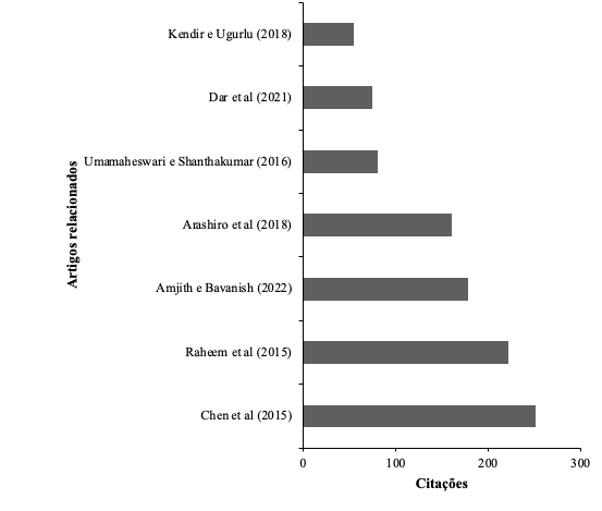 A identificação dos trabalhos mais relevantes (Figura 7), revelou sete artigos com mais de 50 citações, que foram selecionados para discussão qualitativa. Dos artigos mais citados entre os trabalhos da área, seis consistem de artigos de revisão, o que justifica as suas amplas utilizações, uma vez que sintetizam as considerações mais relevantes do tema, sendo importantes para demais autores no desenvolvimento de seus respectivos trabalhos.