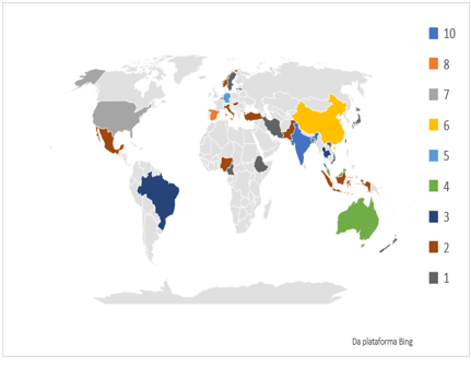 Figura 2: Relação dos números de artigos obtidos na Plataforma WoS por país de origem.