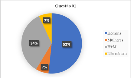 O primeiro questionário foi aplicado com intuito de verificar o conhecimento prévio das/osestudantes sobre o tema “mulheres na Ciência”. Para a questão (1): “De quais cientistas (homem ou mulher) você se lembra? Cite o(s) nome(s).”, o resultado apresentado (Figura 3) demonstra que 52% das/osestudantes citaram apenas nomes de cientistas homens, sendo que o nome mais citado foi de Albert Einstein, prefigurando, assim, uma tendência que se nota com relação aos estereótipos na Ciência. Por meio dos levantamentos bibliográficos realizados, percebe-se que a Ciência é geralmente associada a homens, brancos e ocidentais, fato que nos leva a constatar que, apesar dos esforços, ainda é necessário retificar tal tendência etnocêntrica da Ciência, uma vez que “...a ciência é uma construção social, cultural e histórica” (Wortmann; Veiga-Neto, 2001).