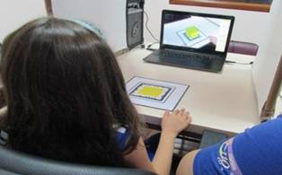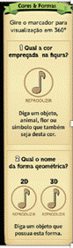 •Reconhecimento das formas geométricas: aprendizado sobre o nome das formas, em 2D no marcador e 3D no monitor, com giro 360º para a visualização da forma; •Pode-se ouvir o nome das formas, através dos ícones aplicados na interface; •Relação com outros objetos: lembrança de outros objetos com as mesmas formas. |