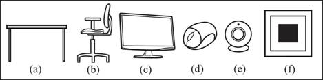 Figura 6 – (a) Mesa; (b) Cadeira; (c) Monitor; (d) Mouse; (e) Câmera e (f) Marcador