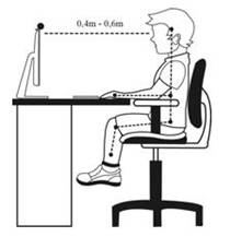 Diretriz 2: Preparar a altura correta e a distância favorável da tela do computador em relação ao usuário: topo da tela no nível ou pouco abaixo dos olhos, a uma distância entre 0,4m a 0,6m. O usuário deve ser capaz de mover a cabeça para baixo, viabilizando movimentos confortáveis. O movimento de olhar entre 15º acima e abaixo da linha média de visão ainda é confortável (Kroemer; Grandjean, 2005). Isto significa que as tarefas visuais devem ocorrer em um cone de 30º em torno da linha principal de visão. Assim como a tela do computador deve ser regulável para ajustes e estar posicionada de acordo com a ABNT (NBR 9050) a uma distância do usuário entre 0,4m e 0,6m (Iida, 2006), conforme a Figura 7.
