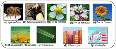 Os participantes, organizados em duplas, receberam uma cartolina, um tabuleiro com dez casas na horizontal e sete na vertical, e um conjunto de 12 cópias de nove diferentes elementos, conforme mostrado na Figura 1. As figuras incluíam duas espécies de abelhas (Apis mellifera e Xylocopa grisescens), três tipos de flores e/ou inflorescência (girassol, maracujá e morango) e quatro agentes que prejudicam a polinização das abelhas (desmatamento, queimadas, agrotóxicos e urbanização).