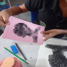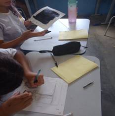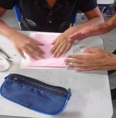 Destrinchando os comandos realizados pela confecção da xilogravura, inicialmente,os estudantes desenharam no papel emborrachado forçando o lápis na superfície, conforme a imagem 4. Em seguida, passaram a esponja com tinta guache sobre o papel emborrachado carimbando no papel de ofício, conforme asfotos 5 e 6.