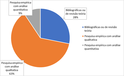 Com relação ao descritor “tipo de pesquisa”, 63% dos textos da amostra trazem os resultados de pesquisas empíricas com análise qualitativa, 28% apresentam pesquisas bibliográficas ou de revisão teórica e 9% trazem resultados da aplicação de questionários com análise quantitativa dos dados sendo classificados como pesquisa empírica com análise quantitativa (Figura 02). Percebemos a ênfase no tipo de pesquisa qualitativa, o que tem sido comum na área de ensino, como demonstrado por Schneider; Fujii e Corazza (2017), ao analisarem as abordagens de pesquisa utilizadas em 240 artigos distribuídos em 4 periódicos com escopo para o Ensino de Ciências e constatarem que 215 pesquisas utilizaram a abordagem qualitativa e que 176 artigos se caracterizam como pesquisas empíricas.