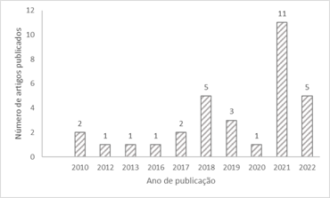 Constatamos através da análise, que em relação ao ano de Publicação, foram publicados textos em 2010, 2012, 2013, 2016, 2017, 2018, 2019, 2020, 2021 e 2022. Notamos também o impacto da pandemia da Covid-19 na abordagem do tema vacinação, uma vez que em 2021 foram publicados 11 textos (Figura 01) relacionados à temática. Na Figura 01 inferimosque as pesquisas na área de ensino de ciências podem estar relacionadas a momentos de crise e impactos sociais, uma vez que 50% da amostra foi publicada nos anos de 2021 até setembrode 2022(momento de constituição do nosso corpus de pesquisa), que correspondia ao período da pandemia de Covid-19.