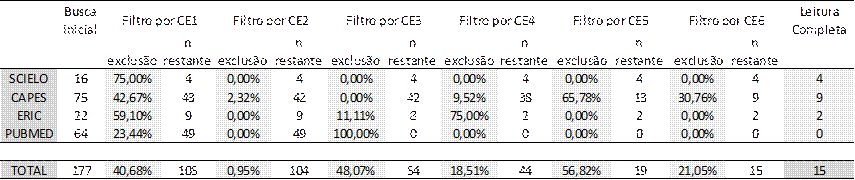 Para realização da pesquisa, as bases de dados empregadas foram: Portal de Periódicos CAPES, Educational Resources Information Centers (ERIC), Scientific Electronic Library Online (SCIELO), PubMed.