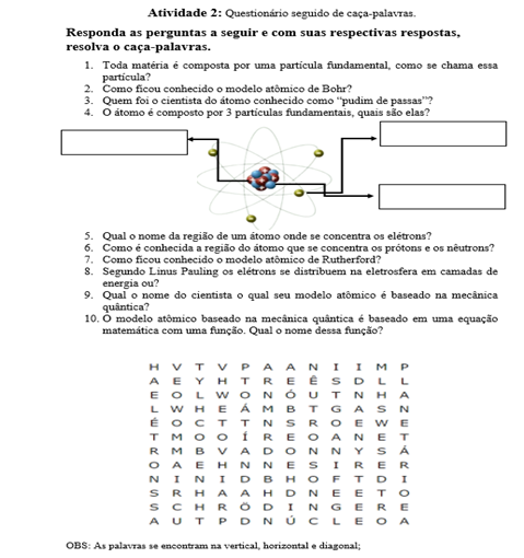 1- Linha do tempo: modelos atômicos; 2- Questionário seguido de caça-palavras; 3- Aula experimental: teste da chama, seguido de um pequeno relatório; |