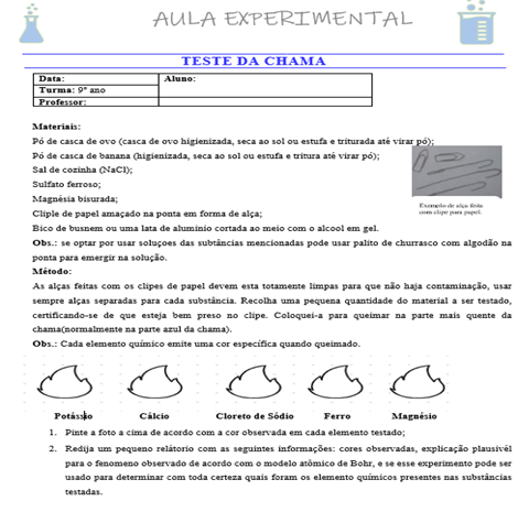 Há a Atividade 3 disposta na Figura 3 trata-se de uma aula experimental com o objetivo de estimular a investigação e a resolução de problemas reais no contexto do estudante, permitindo a reflexão e a mobilização dos saberes, explicando coisas do cotidiano, sem deixar de valorizar os conhecimentos prévios, a aula experimental, intitulada "Teste da Chama" (presente na Figura 3), explica fenômenos cotidianos, como a cor observada nos fogos de artifício.