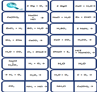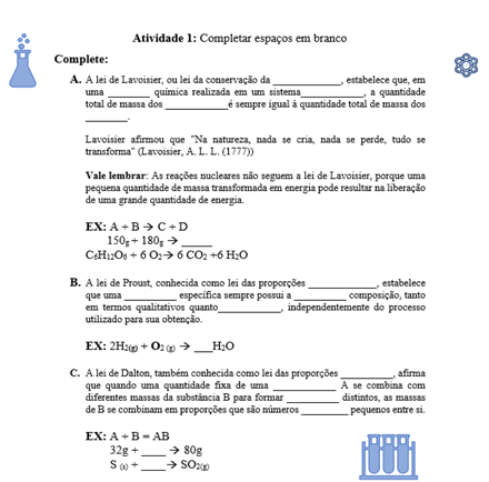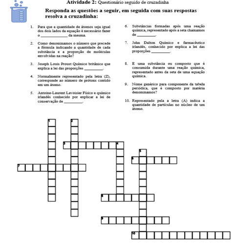 1- Atividade 1: Completar espaços em branco ; 2- Atividade 2: Questionário seguido de cruzadinha; 3- Dominó das reações; |