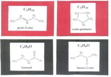Ojogo “Pareando Isômeros”, semelhante ao jogo de memória, foi aplicadono submodelo RPE (Figura 1, Etapa 4, Estação 01). Cinco pares de cartas nas cores marrom, amarelo, verde, vermelho e preto foram elaboradosem papel cartão(10,5x8,0 cm),utilizando o ChemDraw. Asfórmulas químicas, estruturas moleculares e nomenclaturas dos isômerosforam impressas em papel A4, recortadas e cada par de isômeros foi colado nas respectivas cartas, respeitando as mesmas cores.Os isômeros selecionados para comporem as cartas do jogo foram: butan-1-ol/butan-2-ol e 1,2-dimetil-ciclo-hexano/1,4-dimetil-ciclo-hexano (isomeria de posição); butanal/butan-2-ona (isomeria de função); ciclo-pentano/pent-2-eno (isomeria de cadeia); N-metil-N-propilamina/N,N-dietilamina (metameria) e propanal/propenol (tautomeria).Os pares de cartas do jogo “Parenado Isômeros”correspondentes às isomerias de cadeia e de função estão representados na Figura 2.