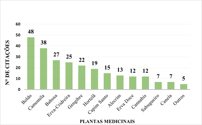 Dentre as respostas dos alunos as plantas mais citadas foram boldo, camomila, babosa, erva cidreira e o gengibre, respectivamente. Resultados bastante semelhantes com Silva et al., (2018) e Santos e David (2019). Para Santos e David (2019) esse conhecimento obtido em relação as plantas medicinais, é categorizado como conhecimento de natureza social passado de geração em geração.