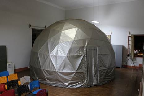 O programa de extensão “Planetário da UFSJ” ocorre desde 2016, com o objetivo de promover a popularização da ciência por meio da astronomia. As ações são realizadas em um planetário com domo fixo, não inflável, estruturado em alumínio geodésico e com capacidade para 30 pessoas (Figura 1).