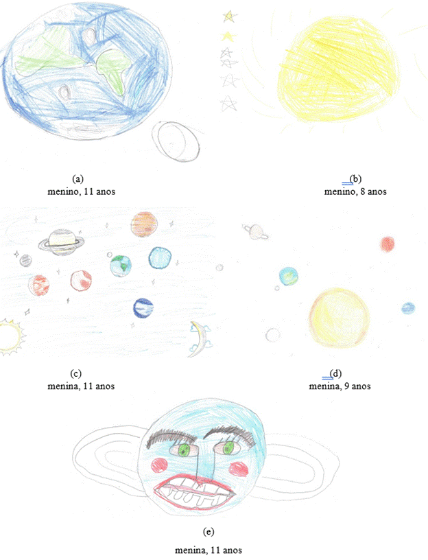 Além das entrevistas, os desenhos elaborados pelas crianças ofereceram indícios adicionais sobre a aprendizagem. A Figura 2 apresenta alguns exemplos. No desenho (a), observa-se a representação da Terra com predominância de azul e detalhes como calotas polares, indicando que o menino de 11 anos se impressionou com a visualização do planeta do espaço. O desenho (b), feito por um menino de oito anos, mostra o Sol e algumas estrelas; duas delas foram coloridas de amarelo, sugerindo que ele compreendeu o Sol como uma estrela.
