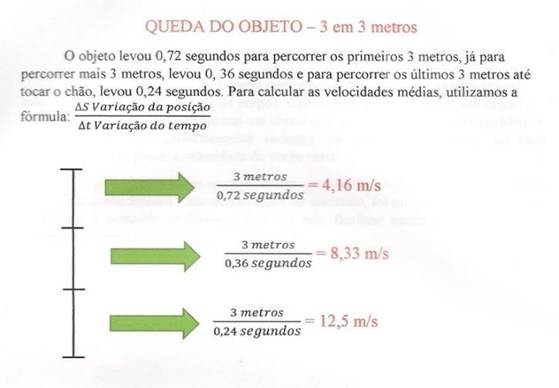 Posteriormente, foram efetuados diversos procedimentos de abandono do corpo da altura máxima, registrando imagens da ocorrência do fenômeno da queda, com o auxílio das câmeras de celular dos educandos. A atividade contou com a motivação da turma, que se empenhou para registrar de forma eficiente a queda para uma análise posterior. O próprio registro foi indicado como alternativa para transpor a dificuldade de visualização detalhada a olho nu, por não se ter obtido êxito ao destacar pontos e cronometrar o percurso dos objetos ao longo da queda.