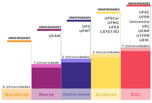 A maior concentração de publicações ocorreu nas regiões Sudeste (11 trabalhos) e Sul (10), enquanto no Nordeste não foram encontrados estudos que atendessem aos critérios de inclusão. No Sul, as publicações estão distribuídas entre 7 universidades; no Sudeste, entre 4; no Centro-Oeste, em 2; e no Norte, em 1. A Figura 1 apresenta as universidades de cada região com publicações.
