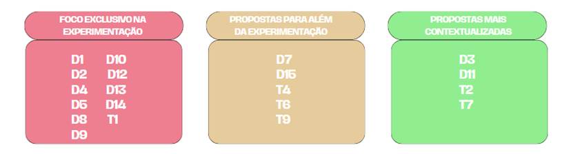Subcategorias - Foco Exclusivo na Experimentação; - Propostas para além da experimentação; - Propostas mais contextualizadas